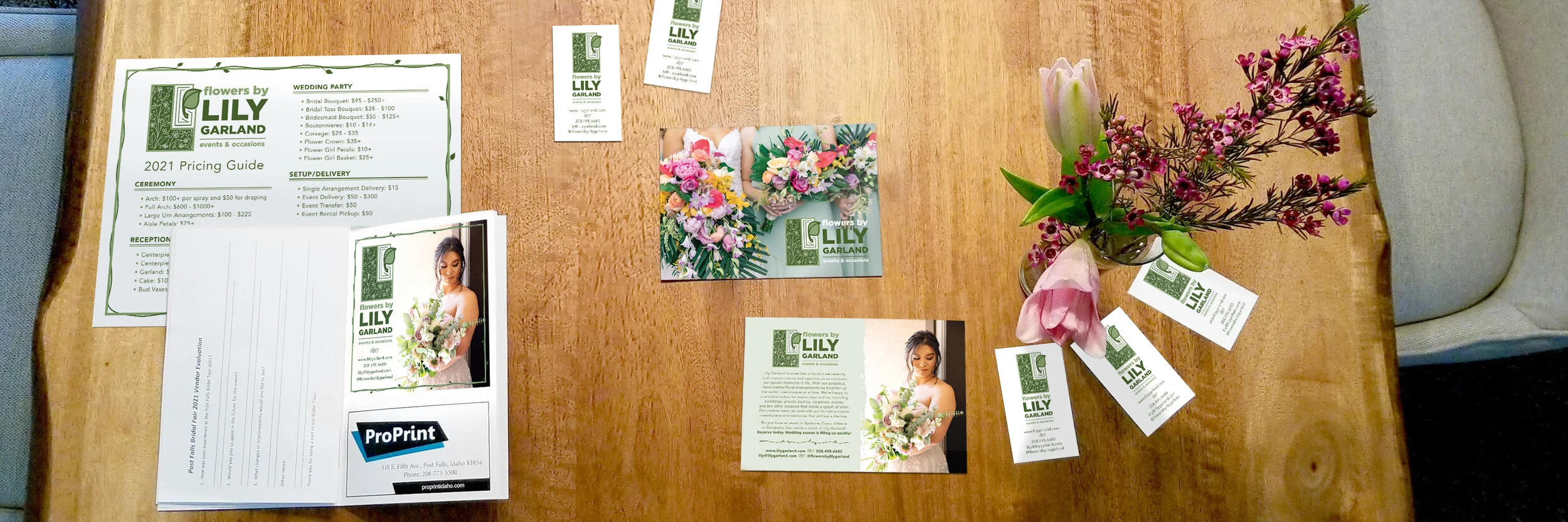 I worked with florist Lily Garland to create the visual brand identity for her company Flowers By Lily Garland. Since 2019 I have designed the Flowers by Lily Garland logo, business cards, pricing sheets, digital signage, a tradeshow standing banner, print ads, and various other brand graphics and promotional materials.